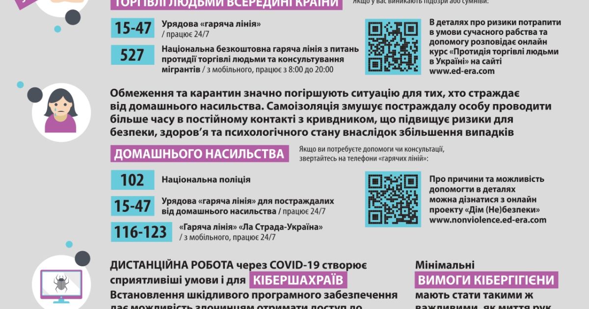 Якщо Ви постраждали від торгівлі людьми за кордоном або в межах України, зателефонуйте за телефоном Департаменту боротьби зі злочинами, що пов'язані з торгівлею людьми Національної поліції України: (044) 374 37 85 (пн – сб. з 09:00 до 18:00)
