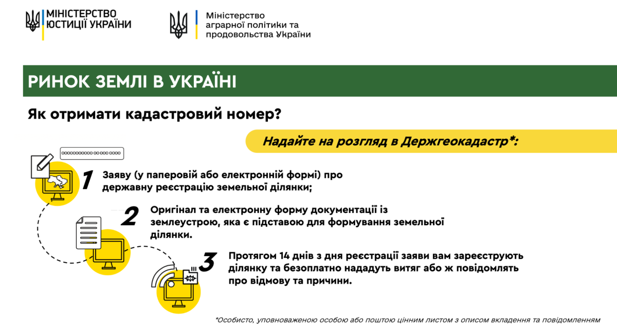 Державний кадастровий реєстратор протягом 14 днів із дня реєстрації заяви реєструє земельну ділянку або надає мотивовану відмову.