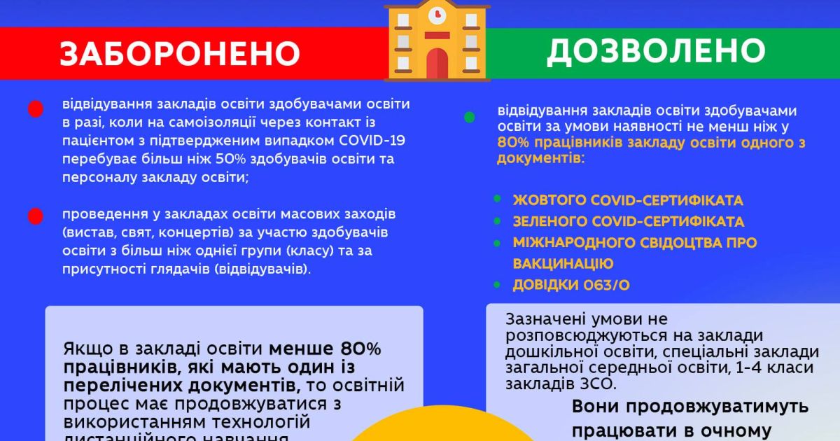умова щодо наявності 80% вакцинованого персоналу НЕ поширюватиметься на заклади дошкільної освіти, спеціальні заклади загальної середньої освіти, 1-4 класи закладів ЗСО. Вони продовжуватимуть працювати в очному форматі з дотриманням протиепідемічних норм;