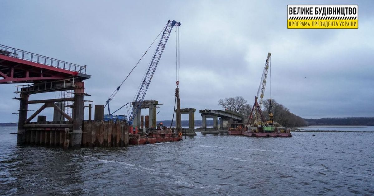 Наразі проводять занурення шпунтового огородження технологічного острівця, зварювання ортотропних плит, завозять пісок для влаштування технологічного острівця, монтують залізобетонні плити технологічного з’їзду.