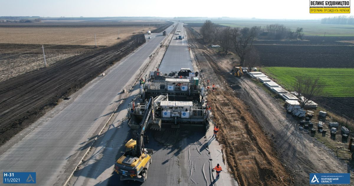 Поблизу села Шевченкове Решетилівської громади триває влаштування важкого бетону. Товщина цього шару – 26 см. Напередодні було влаштовано ще два шари дорожнього одягу: пісний бетон товщиною 18 см та цементогрунт товщиною 30 см.
