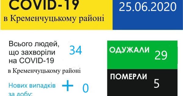 За даними Кременчуцького МВПЛД ДУ «Полтавський ОЛЦ МОЗ України» 25 червня 2020 року в Кременчуцькому районі 34 лабораторно підтверджених випадків COVID-19, з них 5 летальних. Нових випадків за добу не зафіксовано, одужали - 29. Контактних осіб – 268.