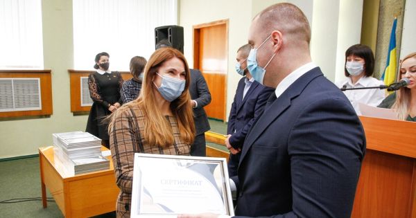 Сертифікати на ноутбуки у середу, 17 листопада, вручили голова облдержадміністрації Олег Синєгубов, заступник голови обласної ради Олексій Чепурко, директор Департаменту освіти і науки ПОДА Віта Ковальська та депутати обласної ради.