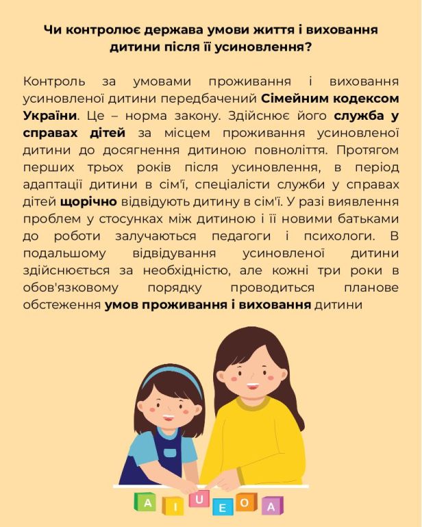 Тільки ця форма влаштування з усіх існуючих має наслідком втрату дитиною статусу дитини-сироти або дитини, позбавленої батьківського піклування. Усиновлення породжує між батьками (усиновителями) та дитиною взаємні права та обов’язки, які передбачені Сімейним кодексом України для батьків та їхніх біологічних дітей. Дитина може бути усиновлена з будь-якої форми влаштування: опіки, прийомної сім’ї, дитячого будинку сімейного типу, інтернатного закладу, якщо вона перебуває на обліку, як дитина, котра підлягає усиновленню