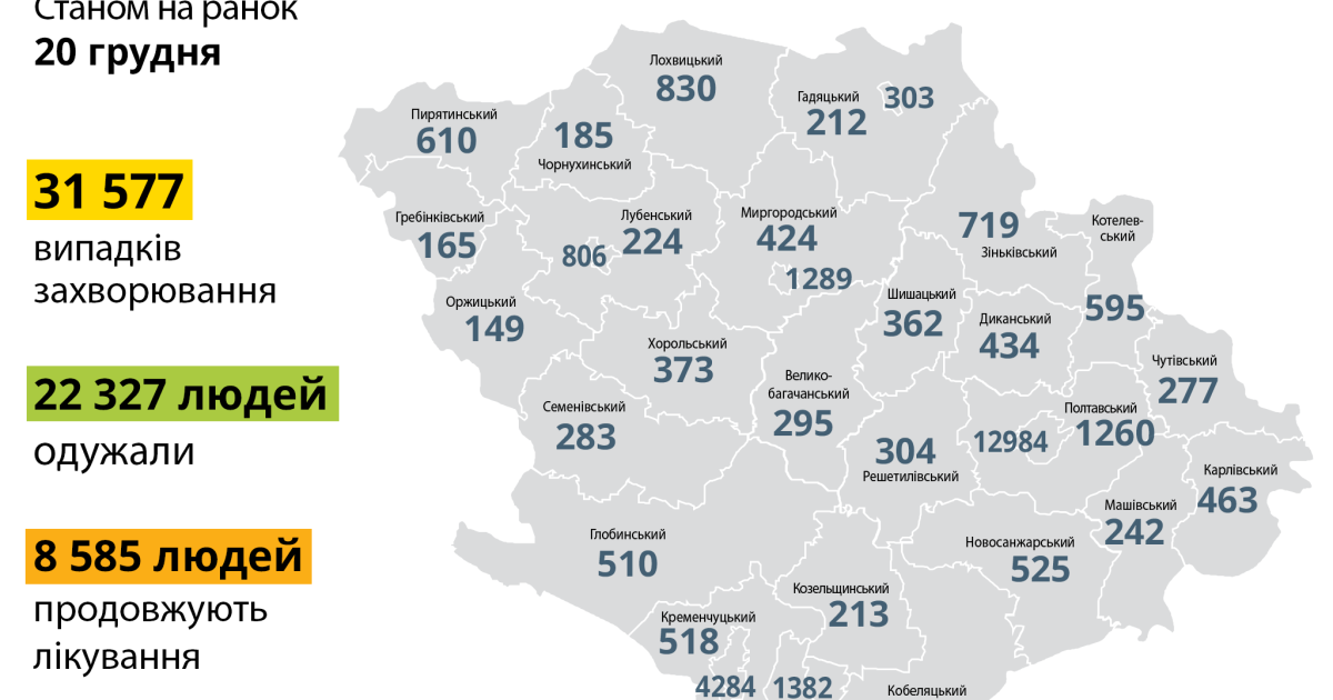За інформацією Полтавського обласного лабораторного центру МОЗ України, від початку карантину на Полтавщині діагностували 31 577 випадків захворювання на COVID-19.