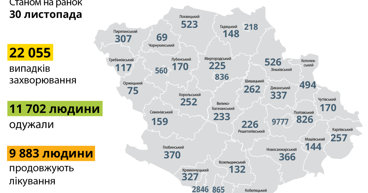 За інформацією Полтавського обласного лабораторного центру МОЗ України, від початку карантину на Полтавщині діагностували 22 055 випадків захворювання на COVID-19. Одужали 11 702 (+35) жителі області. Продовжують лікування 9 883 людини, зокрема 189 дітей. Всього зареєстровано 470 летальних випадків, нових – 7 (Полтава – 6; Глобинський район). За минулу добу зареєстровано нових випадків – 276.
