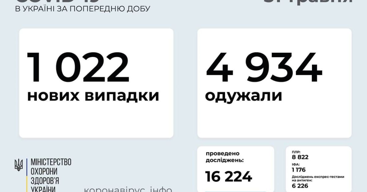 1 022 нових випадки коронавірусної хвороби COVID-19 зафіксовано в Україні станом на 31 травня 2021 року, повідомляє. Зокрема, захворіли 58 дітей та 11 медпрацівників.
