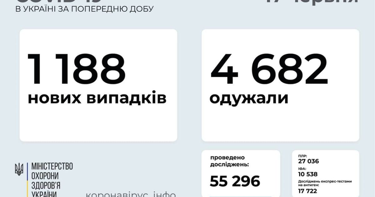 1 188 нових випадків коронавірусної хвороби COVID-19 зафіксовано в Україні станом на 17 червня 2021 року. Зокрема, захворіли 62 дитини та 6 медпрацівників.