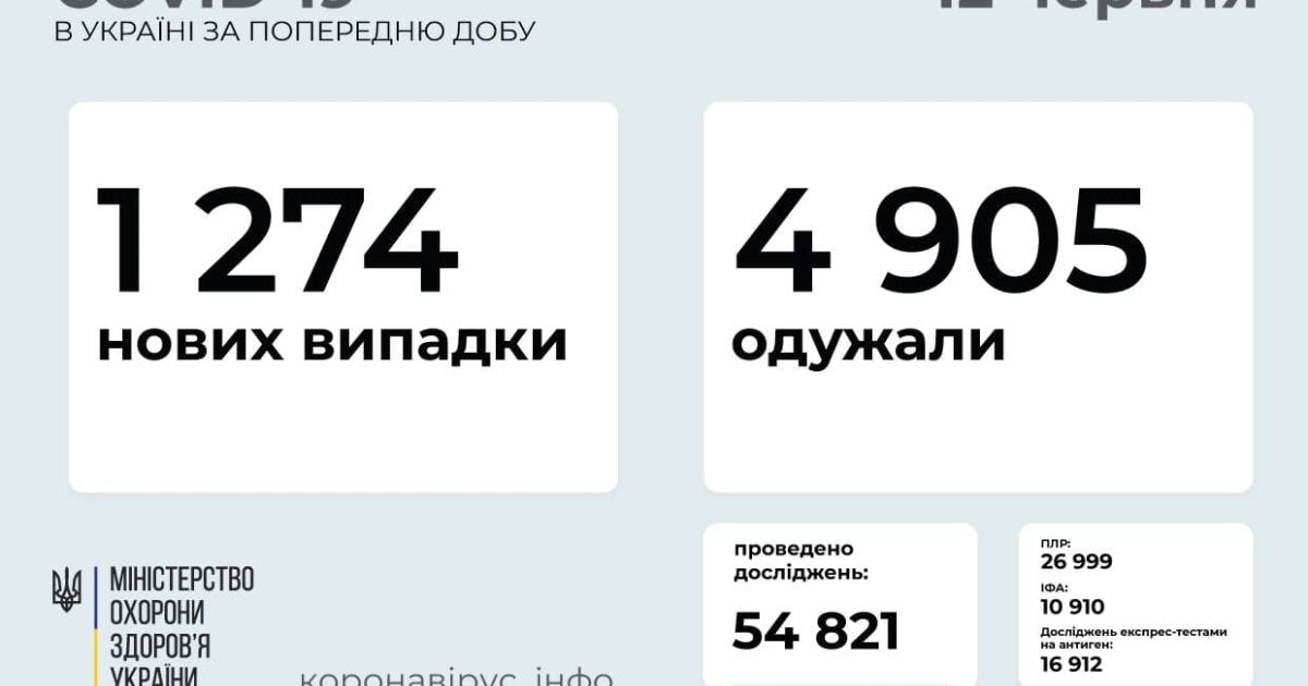1 274 нових випадки коронавірусної хвороби COVID-19 зафіксовано в Україні станом на 12 червня 2021 року. Зокрема, захворіли 40 дітей та 53 медпрацівники.