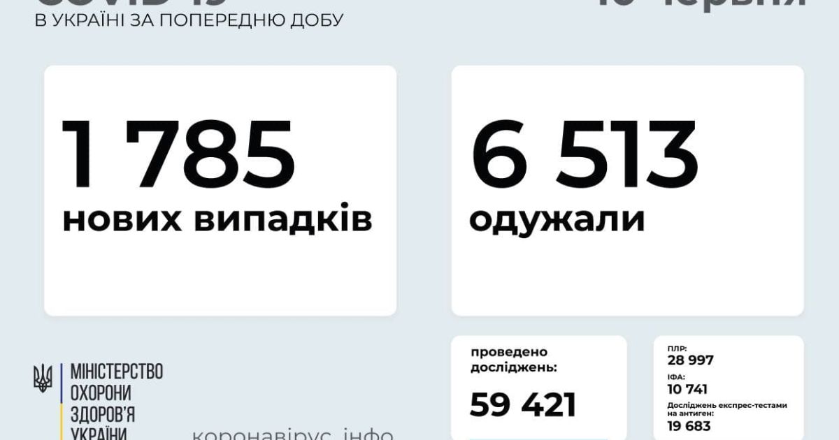 1 785 нових випадків коронавірусної хвороби COVID-19 зафіксовано в Україні станом на 10 червня 2021 року. Зокрема, захворіли 77 дітей та 73 медпрацівники.