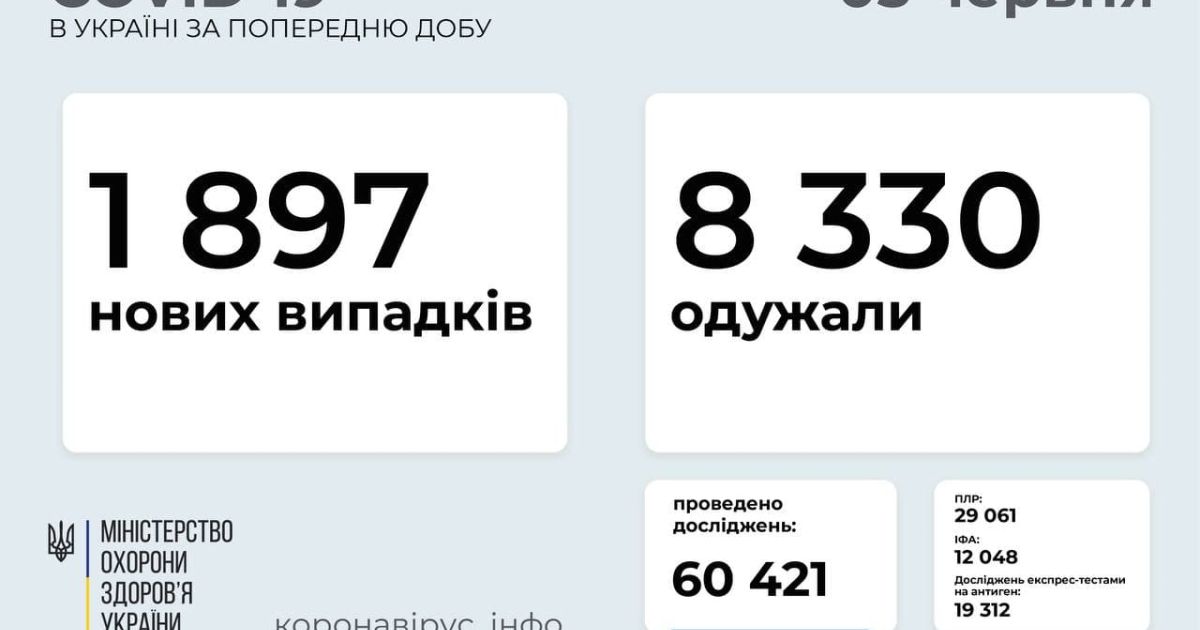 1 897 нових випадків коронавірусної хвороби COVID-19 зафіксовано в Україні станом на 5 червня 2021 року. Зокрема, захворіли 91 дитина та 65 медпрацівників.