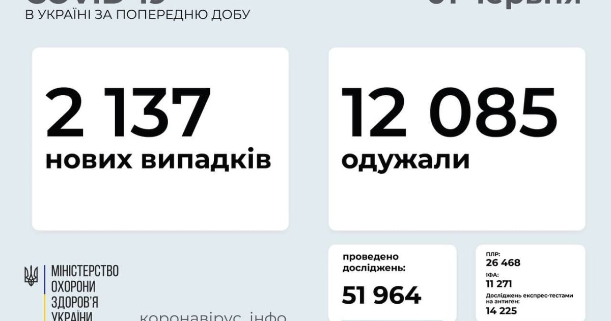 2 137 нових випадків коронавірусної хвороби COVID-19 зафіксовано в Україні станом на 1 червня 2021 року. Зокрема, захворіли 91 дитина та 56 медпрацівників.