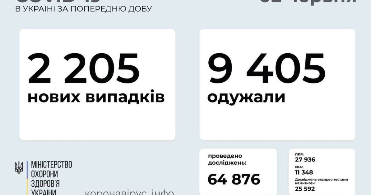 2 205 нових випадків коронавірусної хвороби COVID-19 зафіксовано в Україні станом на 2 червня 2021 року. Зокрема, захворіли 104 дитини та 85 медпрацівників.