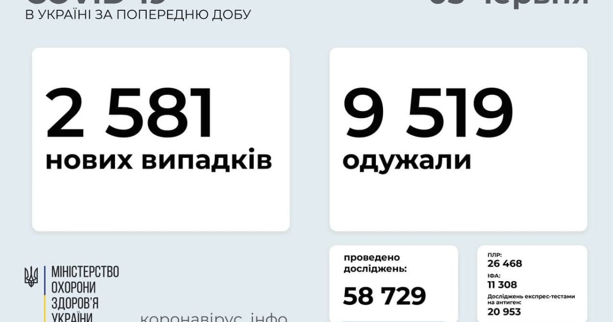 2 581 нових випадків коронавірусної хвороби COVID-19 зафіксовано в Україні станом на 3 червня 2021 року. Зокрема, захворіли 122 дитини та 129 медпрацівників.