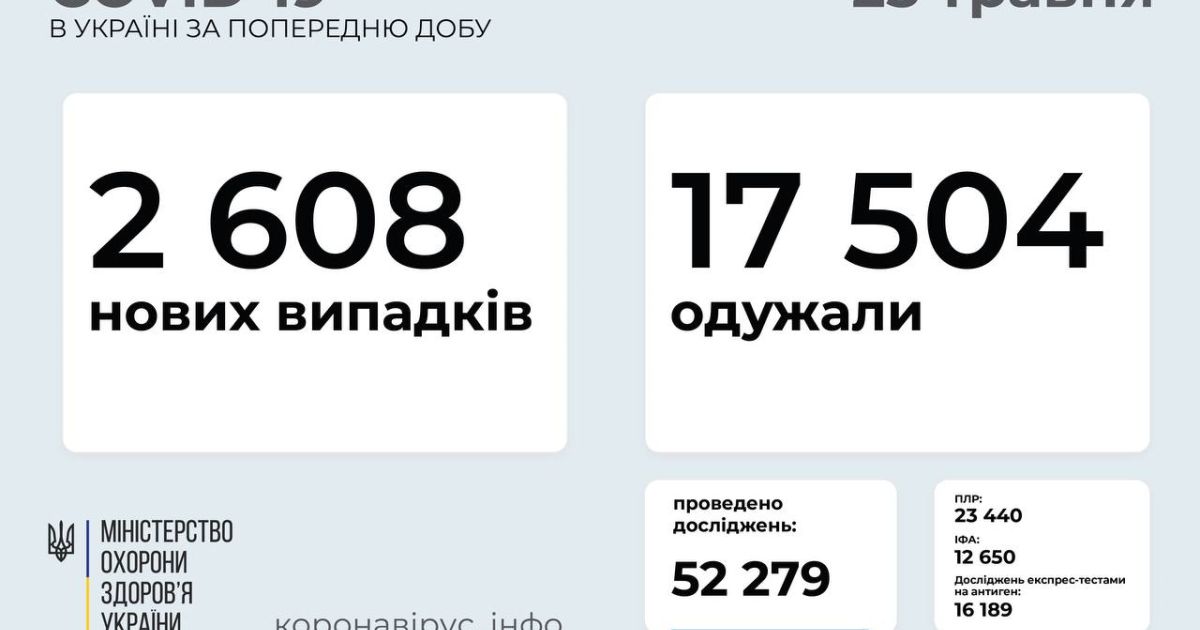 2 608 нових випадків коронавірусної хвороби COVID-19 зафіксовано в Україні станом на 25 травня 2021 року. Зокрема, захворіли 129 дітей та 76 медпрацівників.