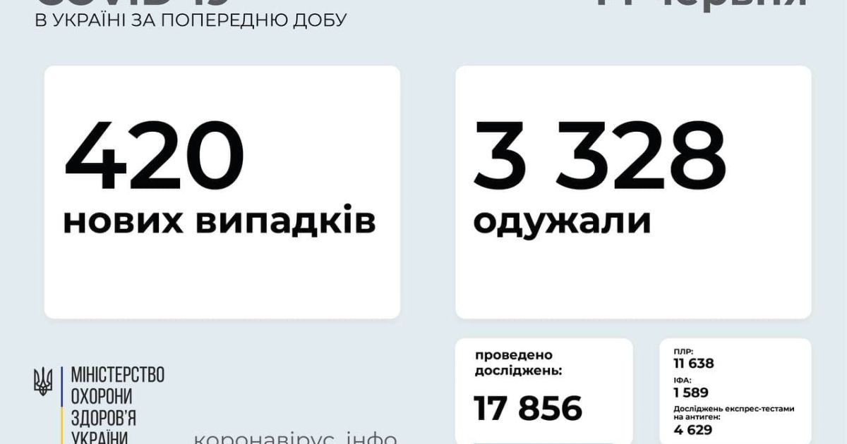 420 нових випадків коронавірусної хвороби COVID-19 зафіксовано в Україні станом на 14 червня 2021 року, повідомляє Міністерство охорони здоров'я України. Зокрема, захворіли 32 дитини та 2 медпрацівники.