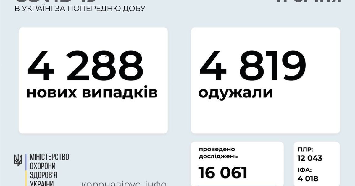 За весь час пандемії в Україні: захворіло – 1 119 314 осіб; одужало – 796 417 осіб; летальних випадків – 19 835; проведено ПЛР-тестувань – 5 781 951.