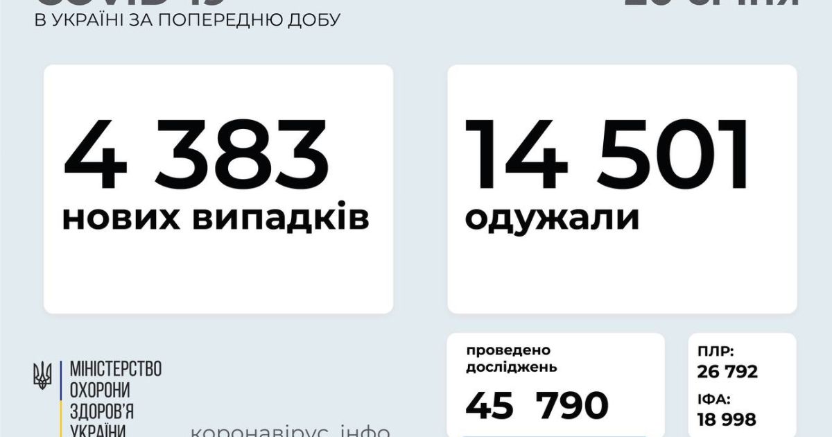 ​​​​4 383 нових випадки коронавірусної хвороби COVID-19 зафіксовано в Україні станом на 20 січня 2021 року. Зокрема, захворіли 161 дитина та 239 медпрацівників.