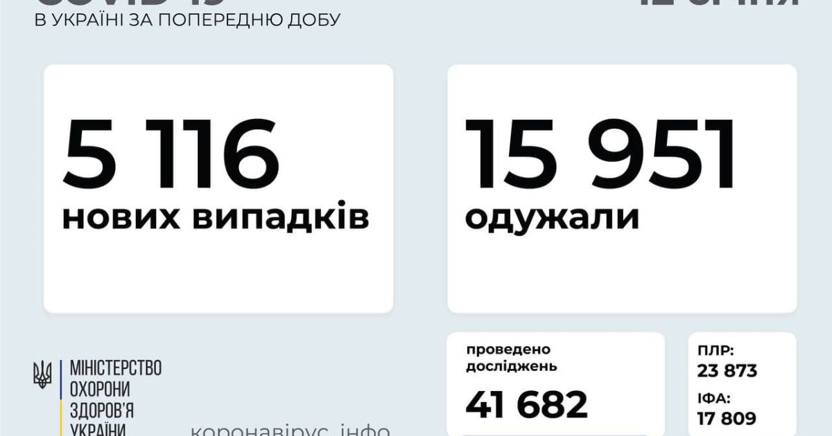 5 116 нових випадків коронавірусної хвороби COVID-19 зафіксовано в Україні станом на 12 січня 2021 року. Зокрема, захворіли 131 дитина та 309 медпрацівників.