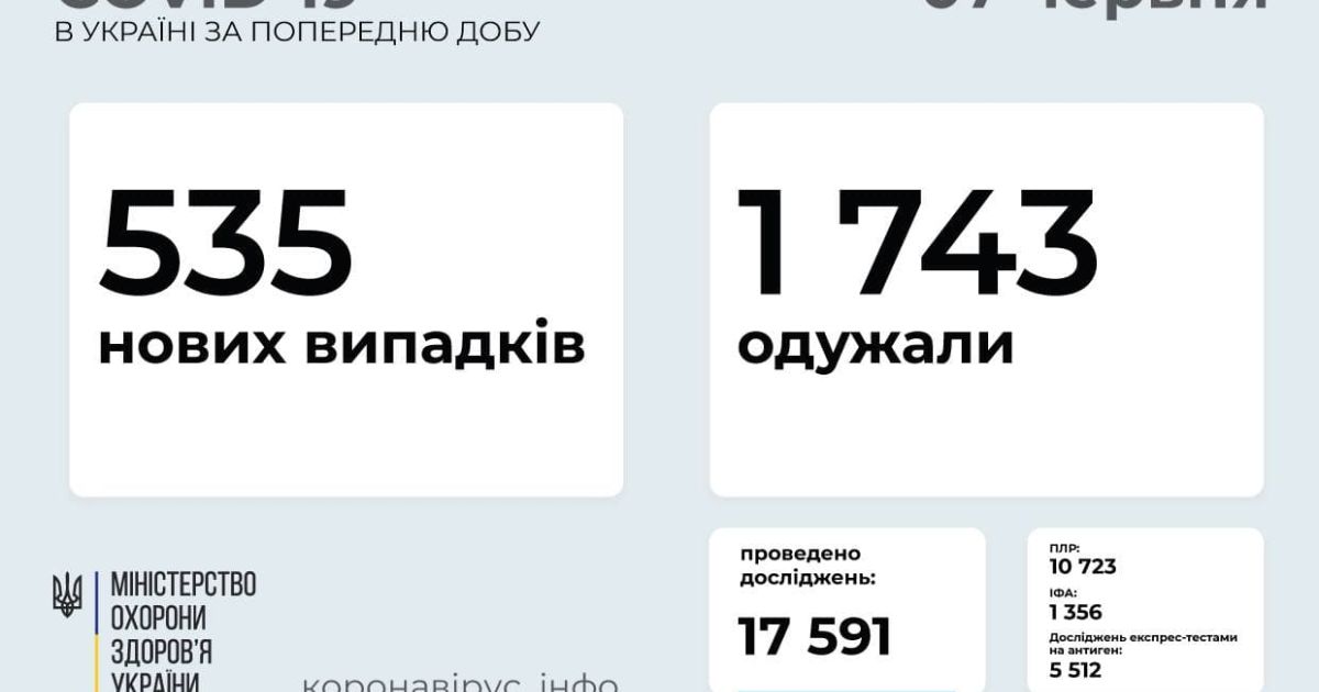 535 нових випадків коронавірусної хвороби COVID-19 зафіксовано в Україні станом на 7 червня 2021 року. Зокрема, захворіли 30 дітей та 61 медпрацівник.