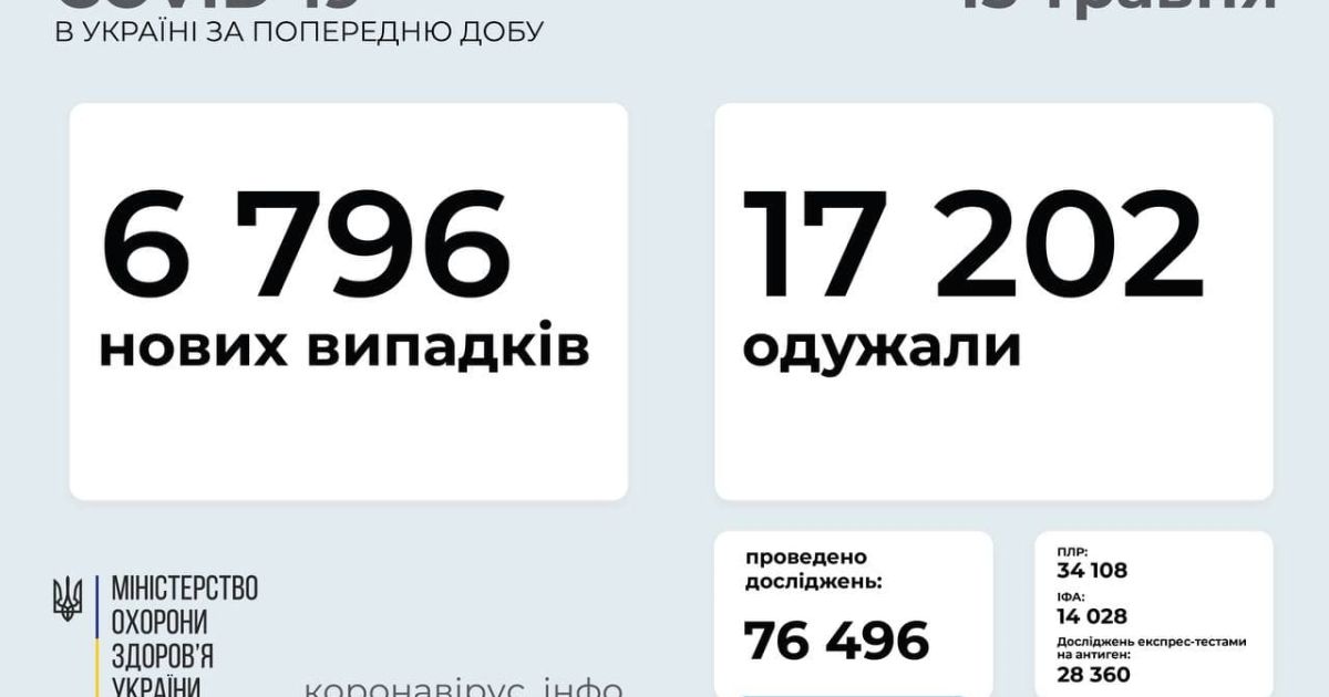 6 796 нових випадків коронавірусної хвороби COVID-19 зафіксовано в Україні станом на 15 травня 2021 року. Зокрема, захворіли 347 дітей та 233 медпрацівники.
