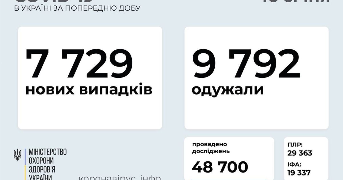 ​​7 729 нових випадків коронавірусної хвороби COVID-19 зафіксовано в Україні станом на 16 січня 2021 року. Зокрема, захворіли 245 дітей та 369 медпрацівників.