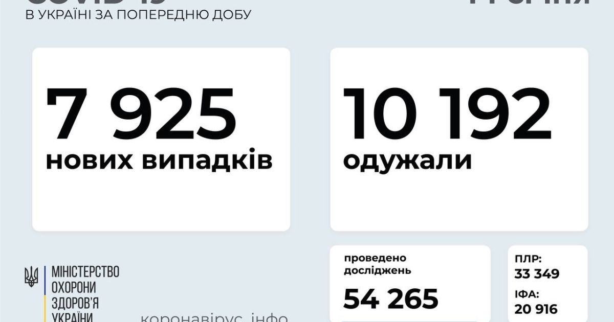 7 925 нових випадків коронавірусної хвороби COVID-19 зафіксовано в Україні станом на 14 січня 2021 року. Зокрема, захворіли 233 дитини та 345 медпрацівників.