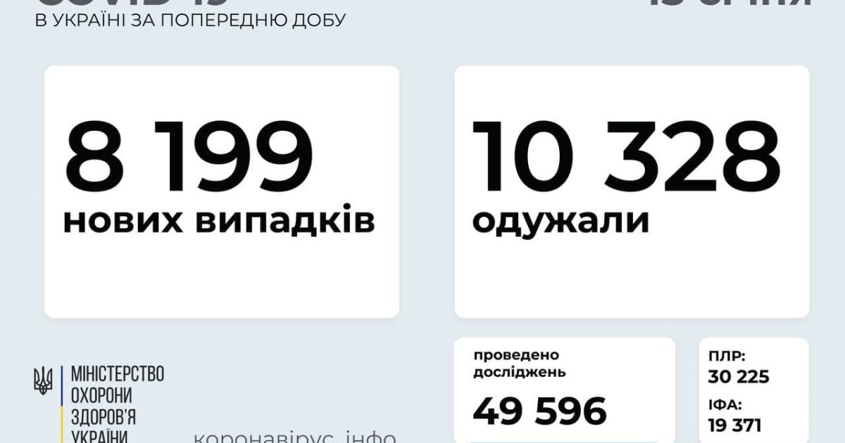 В Україні за добу діагностували 8 199 захворювань на коронавірус