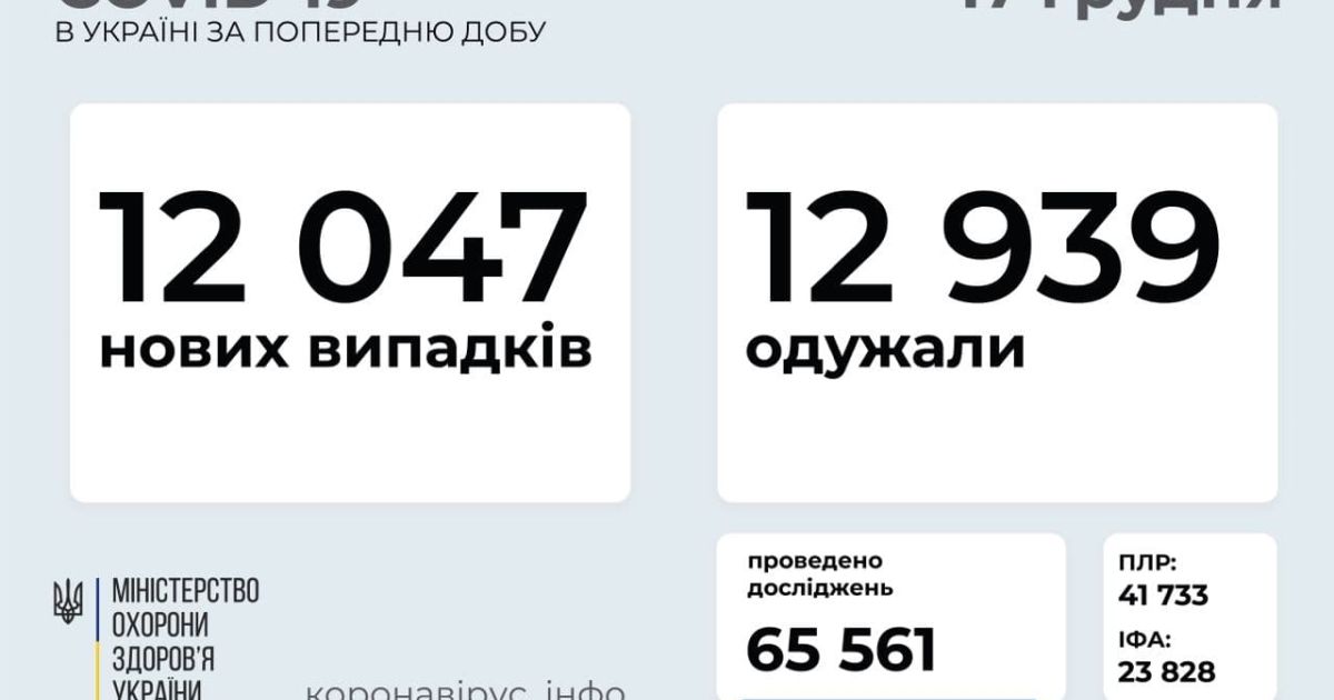 12 047 нових випадків коронавірусної хвороби COVID-19 зафіксовано в Україні станом на 17 грудня 2020 року. Зокрема, захворіли 594 дитини та 535 медпрацівників.
