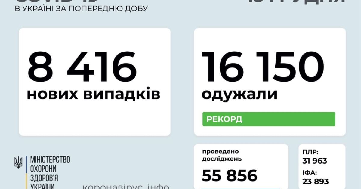8 416 нових випадків коронавірусної хвороби COVID-19 зафіксовано в Україні станом на 15 грудня 2020 року. Зокрема, захворіли 412 дітей та 447 медпрацівників.