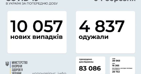 10 057 нових випадків коронавірусної хвороби COVID-19 зафіксовано в Україні станом на 4 березня 2021 року. Зокрема, захворіли 611 дітей та 388 медпрацівників.