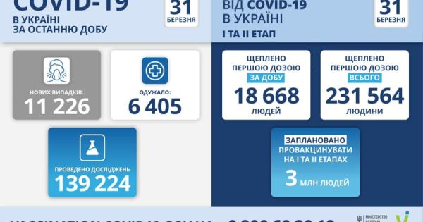 11 226 нових випадків коронавірусної хвороби COVID-19 зафіксовано в Україні станом на 31 березня 2021 року. Зокрема, захворіли 491 дитина та 335 медпрацівників.
