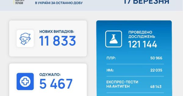 11 833 нові випадки коронавірусної хвороби COVID-19 зафіксовано в Україні станом на 17 березня 2021 року. Зокрема, захворіли 609 дітей та 388 медпрацівників.