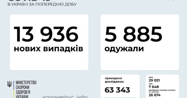 В Україні за добу зафіксовано 13 936 нових випадків коронавірусу