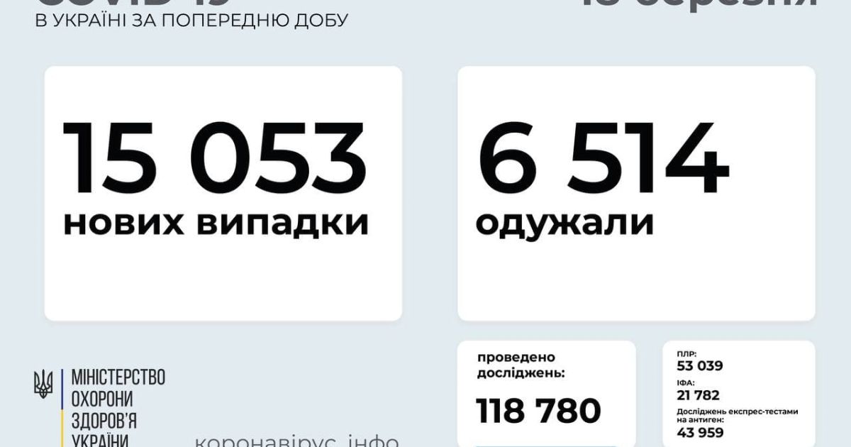 В Україні за добу зафіксовано 15 053 нові випадки коронавірусної хвороби