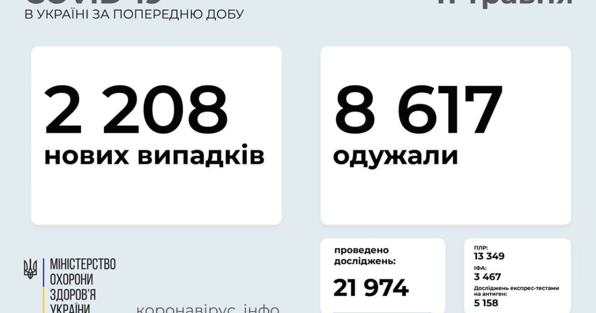 2 208 нових випадків коронавірусної хвороби COVID-19 зафіксовано в Україні станом на 11 травня 2021 року. Зокрема, захворіли 89 дітей та 34 медпрацівники.