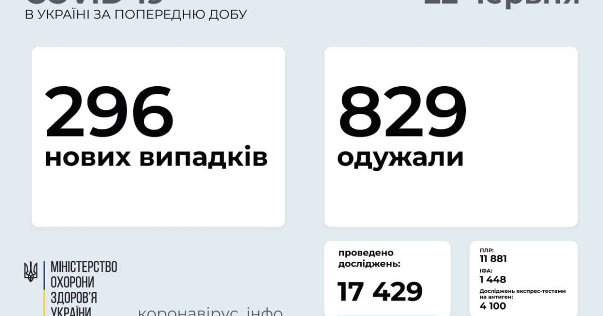 296 нових випадків коронавірусної хвороби COVID-19 зафіксовано в Україні станом на 22 червня 2021 року. Зокрема, захворіли 22 дитини та 2 медпрацівники.