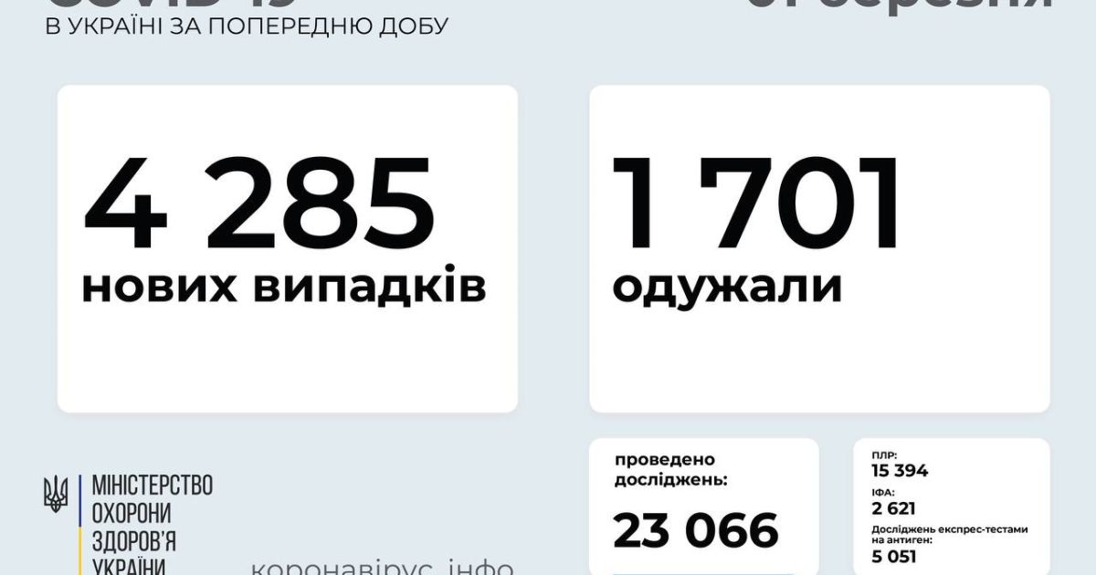 В Україні за добу зафіксовано 4 285 нових випадків коронавірусу