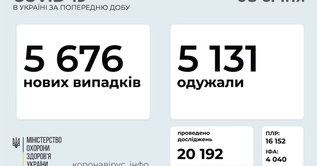 В Україні за добу зафіксовано 5 676 нових випадків коронавірусу