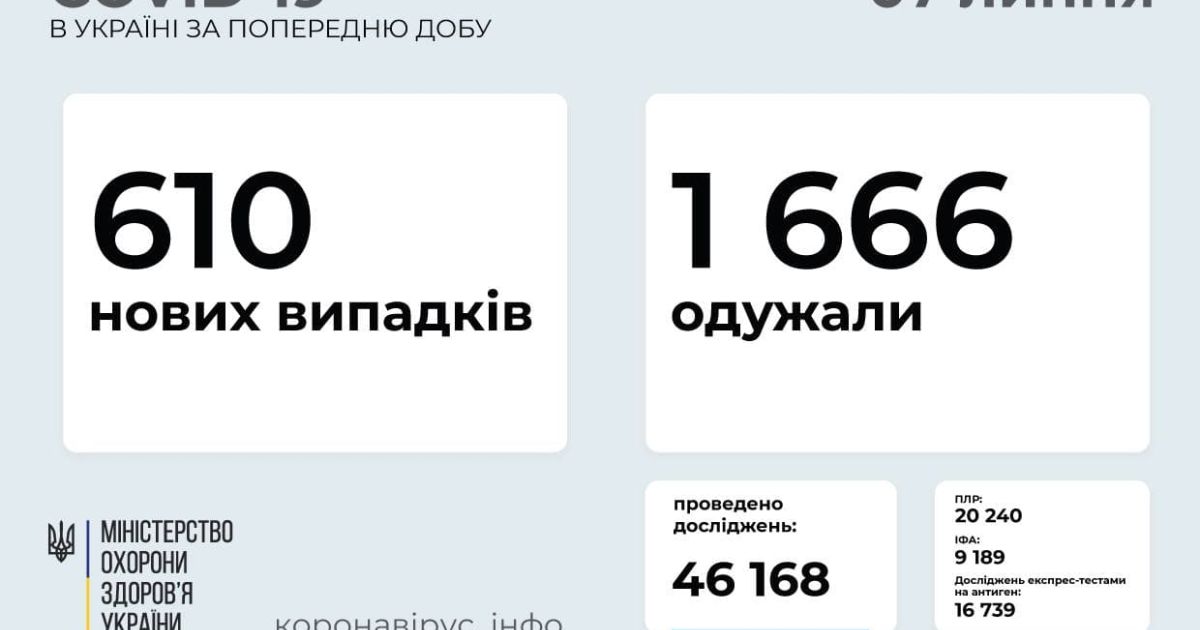 610 нових випадків COVID-19 зафіксовано в Україні станом на 7 липня 2021 року. Зокрема, захворіли 40 дітей та 20 медпрацівників.