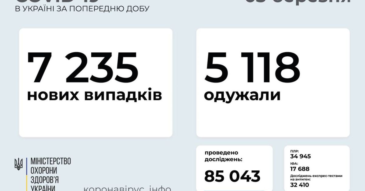 В Україні за добу зафіксовано 7 235 нових випадків коронавірусу