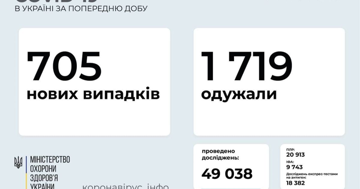 В Україні за добу зафіксовано 705 нових випадків коронавірусу