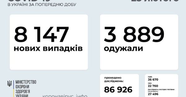 8 147 нових випадків коронавірусної хвороби COVID-19 зафіксовано в Україні станом на 25 лютого 2021 року. Зокрема, захворіли 483 дитини та 301 медпрацівник.