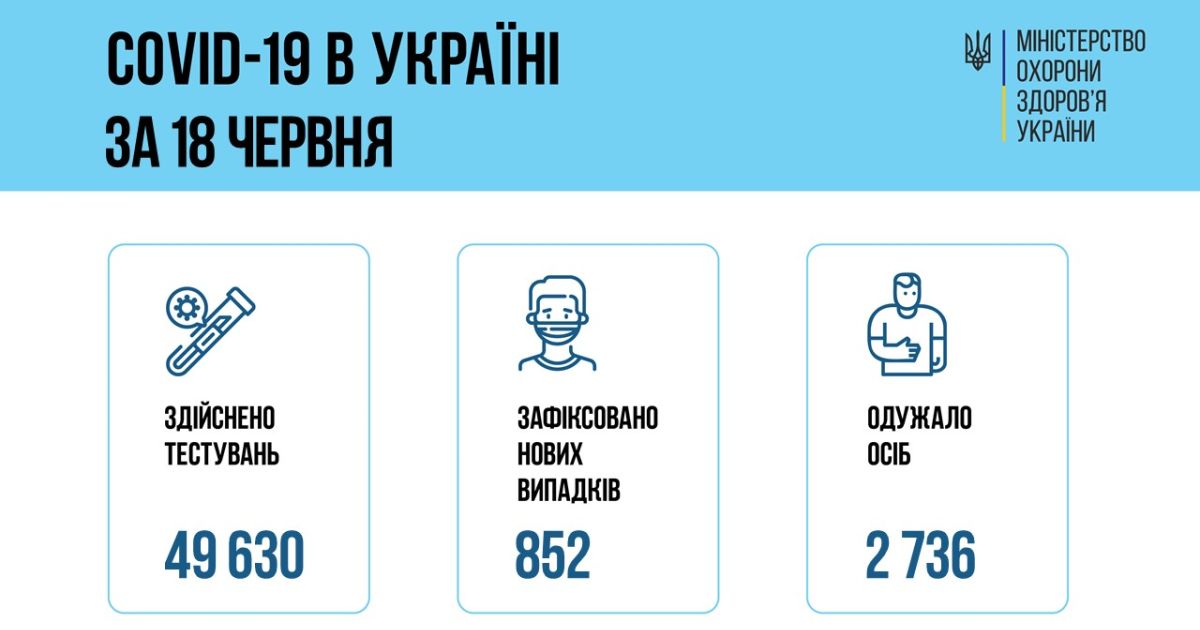 За добу 18 червня 2021 року в Україні зафіксовано 852 нові випадки захворювання на COVID-19. Серед них - 23 дитини та 41 медпрацівник.