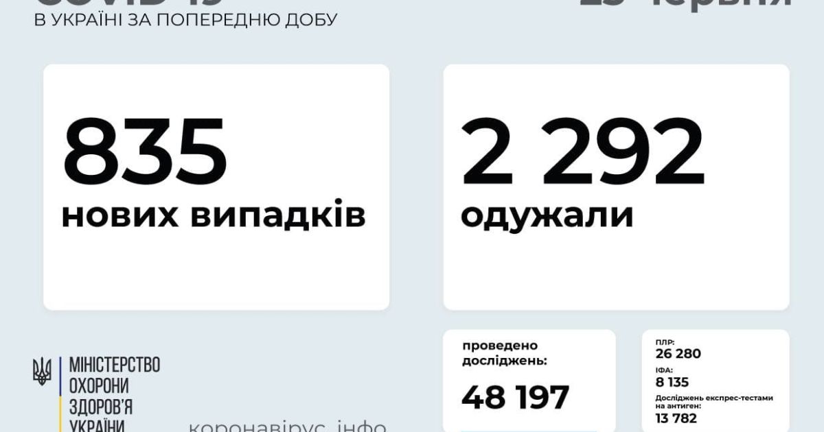 835 нових випадків коронавірусної хвороби COVID-19 зафіксовано в Україні станом на 23 червня 2021 року. Зокрема, захворіли 33 дитини та 25 медпрацівників.