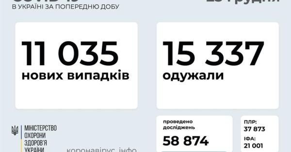 11 035 нових випадків коронавірусної хвороби COVID-19 зафіксовано в Україні станом на 25 грудня 2020 року. Зокрема, захворіли 484 дитини та 388 медпрацівників.
