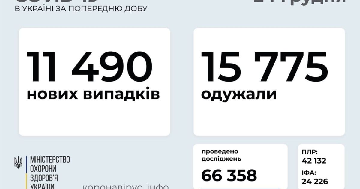 11 490 нових випадків коронавірусної хвороби COVID-19 зафіксовано в Україні станом на 24 грудня 2020 року. Зокрема, захворіли 488 дітей та 445 медпрацівників.