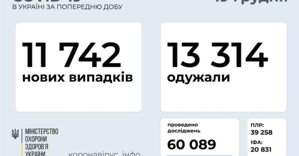 11 742 нові випадки коронавірусної хвороби COVID-19 зафіксовано в Україні станом на 19 грудня 2020 року. Зокрема, захворіли 547 дітей та 481 медпрацівник.