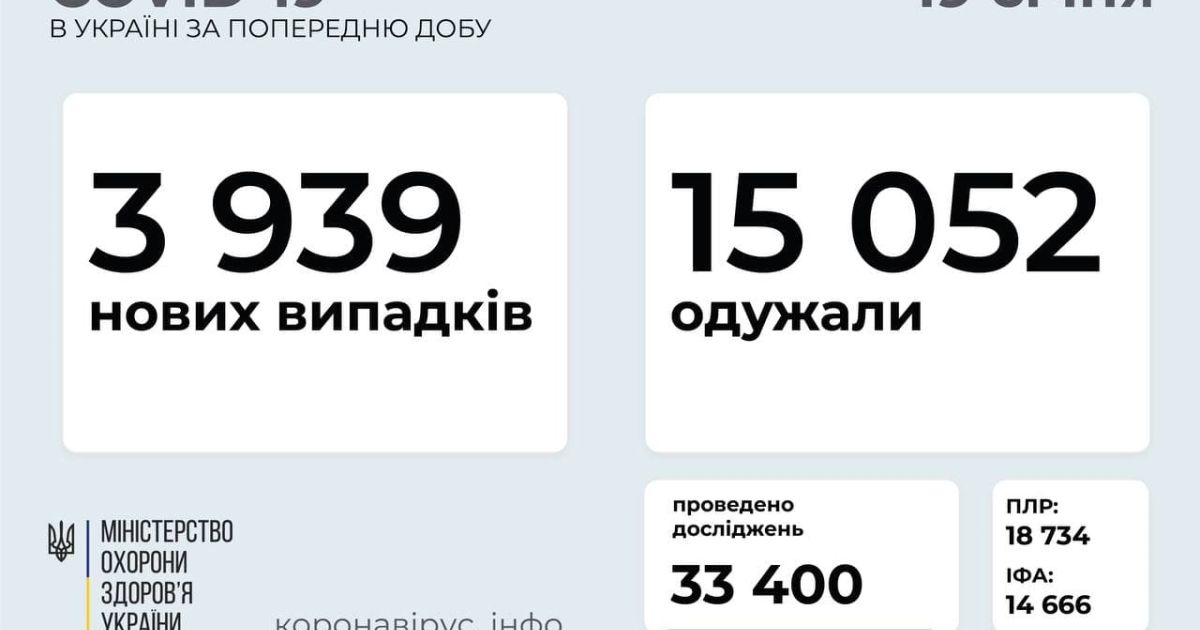 3 939 нових випадків коронавірусної хвороби COVID-19 зафіксовано в Україні станом на 19 січня 2021 року. Зокрема, захворіли 131 дитина та 238 медпрацівників.