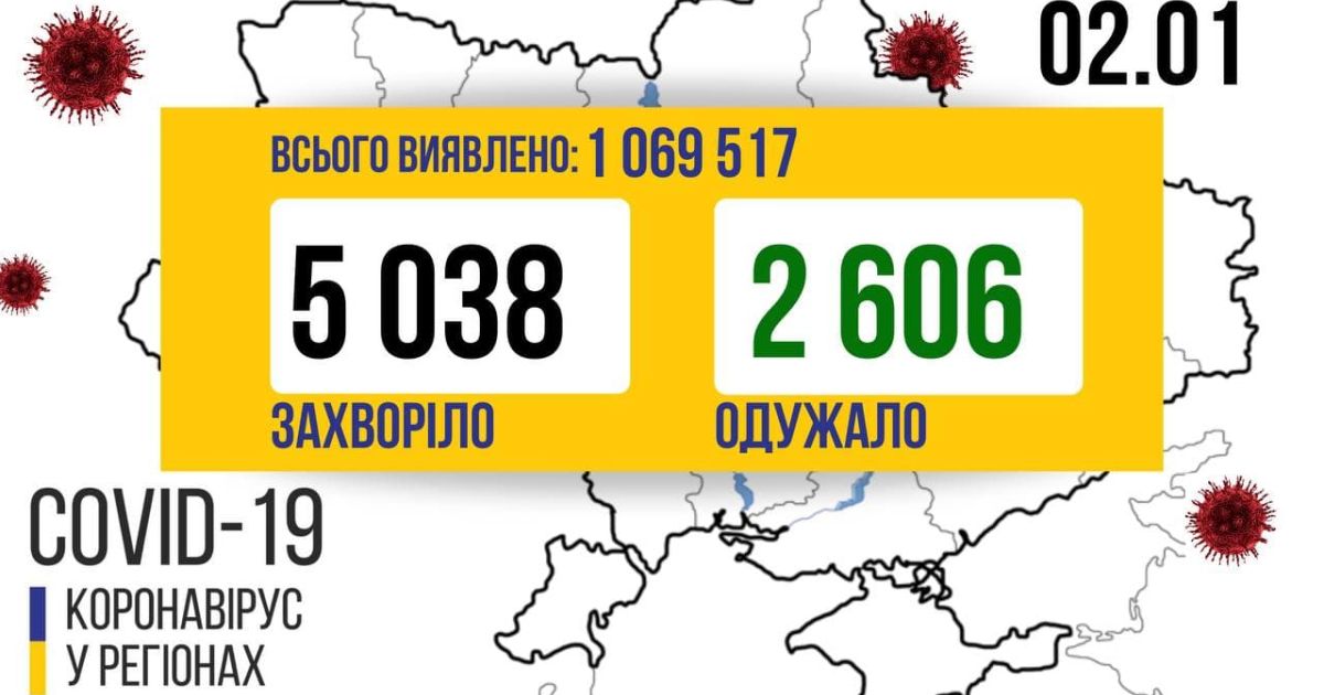5 038 нових випадків коронавірусної хвороби COVID-19 зафіксовано в Україні станом на 2 січня 2021 року. Зокрема, захворіли 182 дитини та 131 медпрацівників.